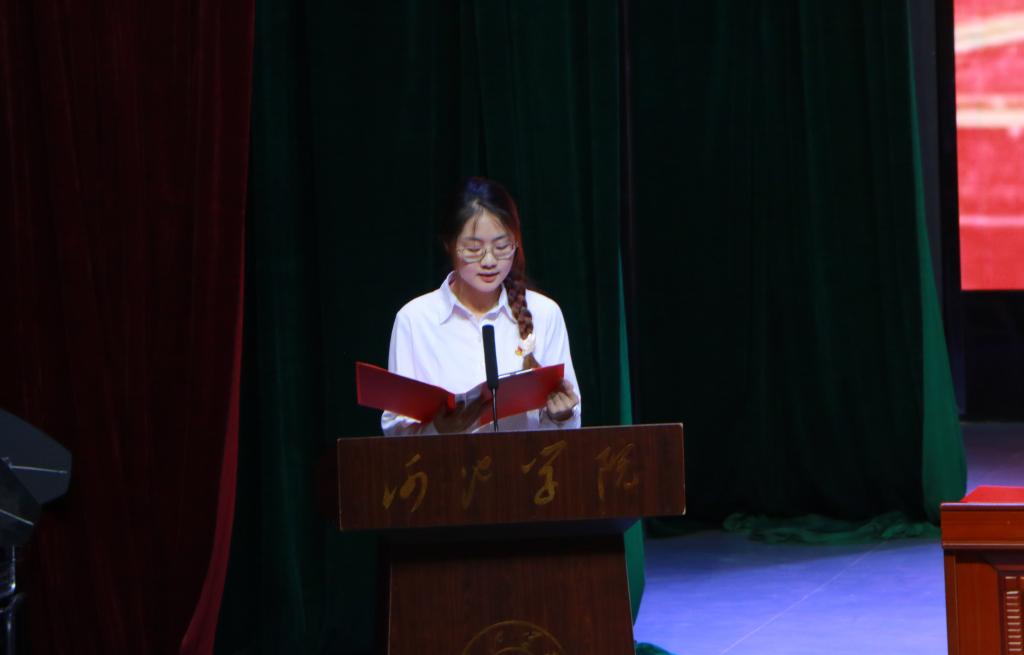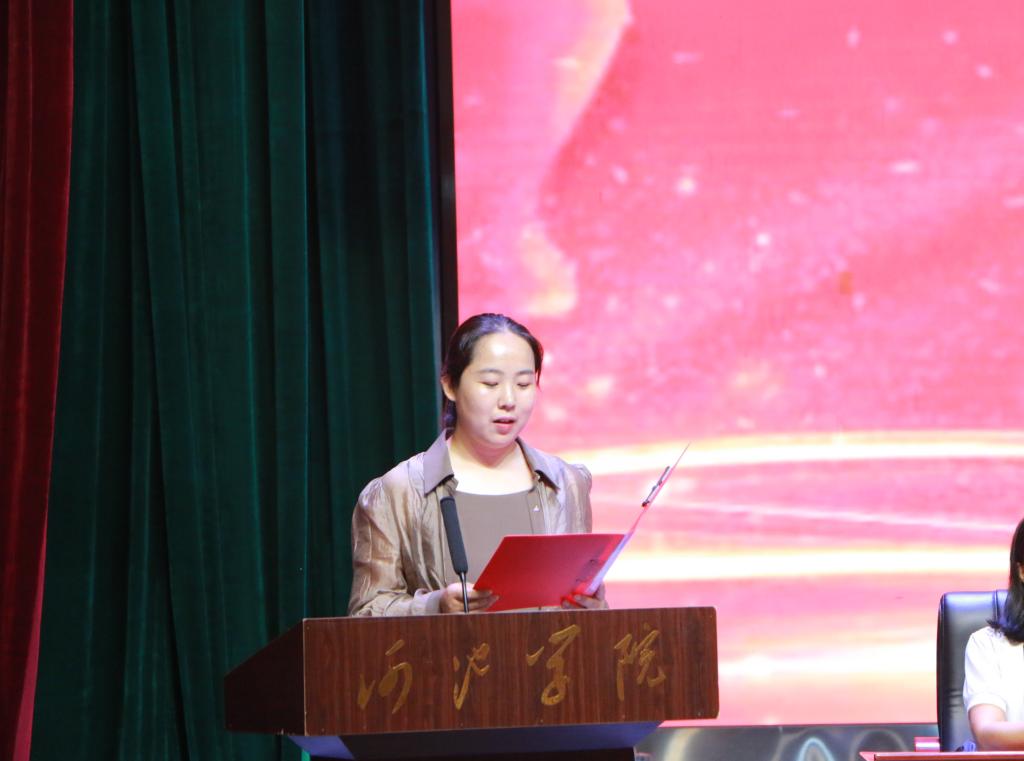 本次会议由郭英莉主持。会议主要有五项议程:全体起立,唱中华人民共和国国歌;教师代表赵君超老师发言;老生代表2021级学前教育专业彭慧芳发言;新生代表2023级小学语文专业A班谢易真同学发言;党委书记李新富讲话。