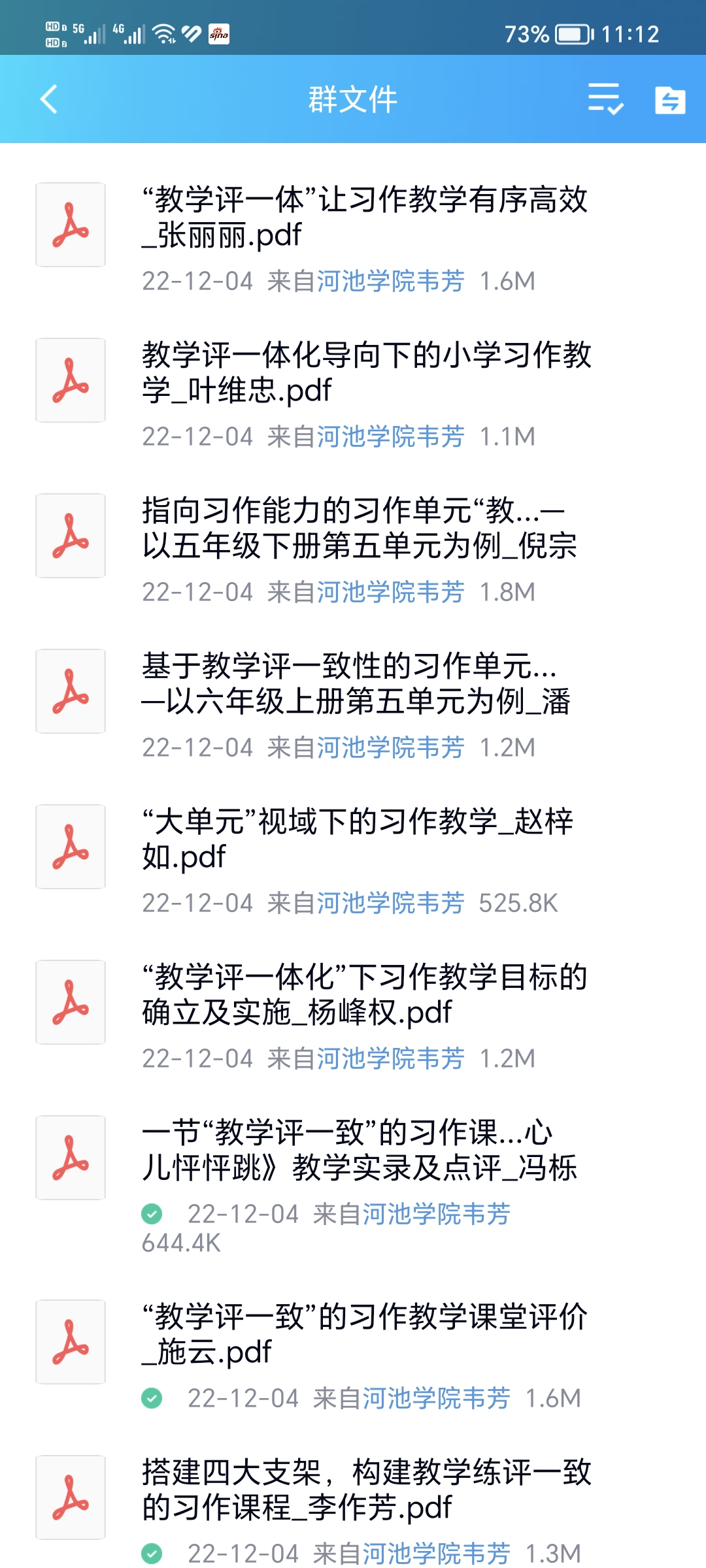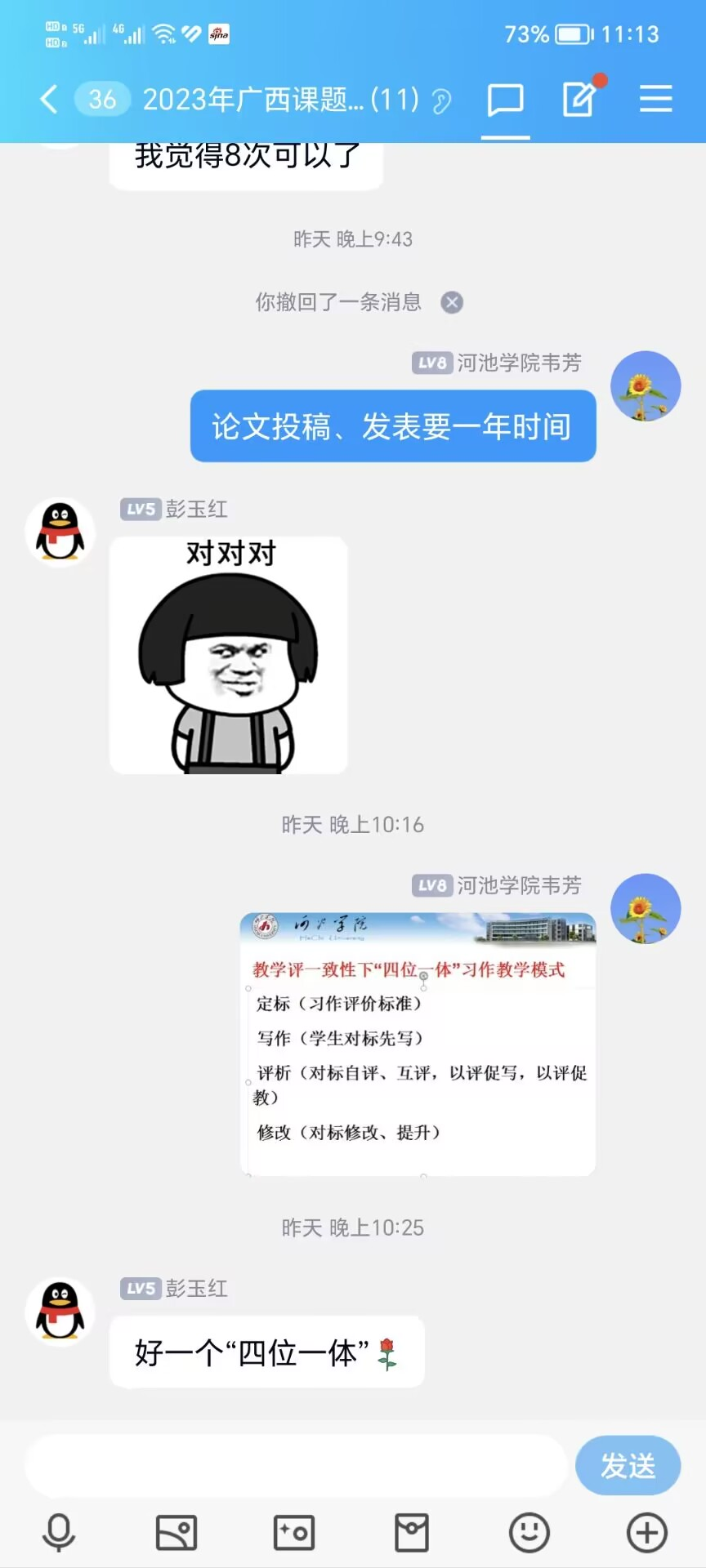 开题报告论证会后,韦芳教授利用宜州区实验小学课题组QQ群、微信群平台,拓展课题组教师学习空间,发送课题“教学评一致”相关教学论文与实践案例资源,线下引领课题组构建“教学评一致性下‘四位一体’习作教学模式”。课题负责人彭玉红在线上交流时表示,有了高校的引领,我们的研究有了方向,我们将一往无前。