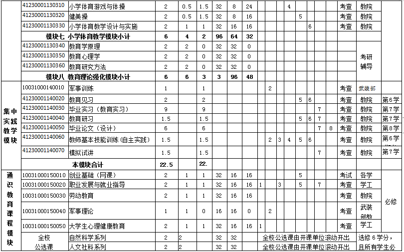 毕业学分:158学分,其中公共基础课程31学分,学科专业课程55.5学分(其中必修35.5,选修20分),教师教育课程32分(其中必修30分,选修2分),集中性实践22.5学分,通识课程17学分。