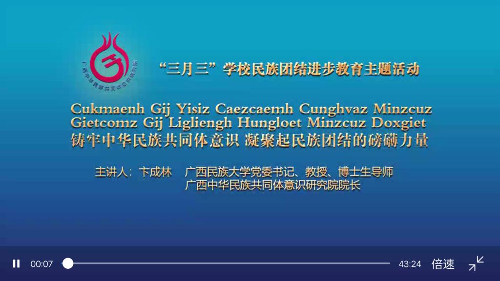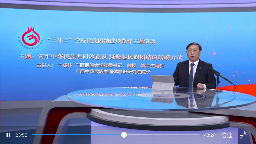 3月26日上午,william威廉中文官网开展“三月三”公司民族团结进步教育主题活动。本次活动以线上直播的方式进行,由广西民族大学党委书记、教授、博士生导师卞成林主讲。教院全体员工通过网络直播参与了本次主题活动。