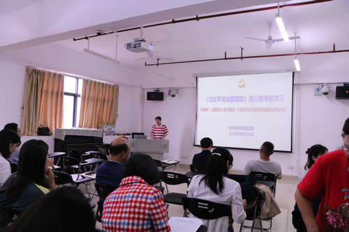 最后,全体教职工一起观看了专题学习视频,由教育部社科中心主任、教授、博士生导师王炳林所作的《全面深入学习领会<习近平总书记教育重要论述讲义>——<习近平谈治国理政>(第三卷)》专题辅导报告。通过王教授的系统导读,大家普遍感到获益匪浅,理论视野得到了进一步开阔,尤其是对如何准确把握习近平总书记关于教育工作的重要论述的精神实质及其重大的理论与现实意义等方面有了更全面更深刻的认识。