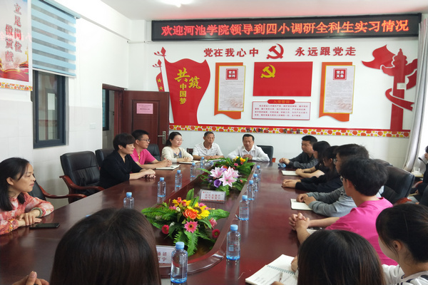 邓琴一行先后走访南丹县第一小学、第二小学、第三小学、第四小学及天峨县八腊瑶族乡中心小学、向阳镇中心小学,看望慰问全科实习生。在县教育局领导、实习公司领导、老师的陪同下,调研组一行实地查看了实习员工的公司产品、班级管理及生活学习情况,向实习单位领导、实习指导教师详细了解了实习员工的工作表现、思想动态和生活情况,并结合小学教育(全科)专业人才培养的目标定位、课程设置和实践实训等,与一线教师围绕小学全科教师的专业技能、职业道德和职业生涯规划等进行深入研讨,针对全科教师的专业技能提升和教师礼仪培训等方面提出了建设性的意见和建议。在与公司领导老师交谈过程中,实习员工纷纷表示,将珍惜实习机会,将理论知识转化为教学实践,努力提升自身的教学能力。