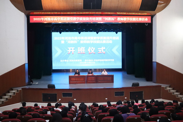 10月23日,2022年高中英语课堂教学质量提升暨“河教杯”教师教学技能比赛在公司艺术楼表演厅举行,william威廉中文官网经理邓琴、河池市教育科学研究所教研员冯斌出席开班仪式。河池市各县区教研员代表和高中英语老师代表,以及公司部分师生代表参加活动。