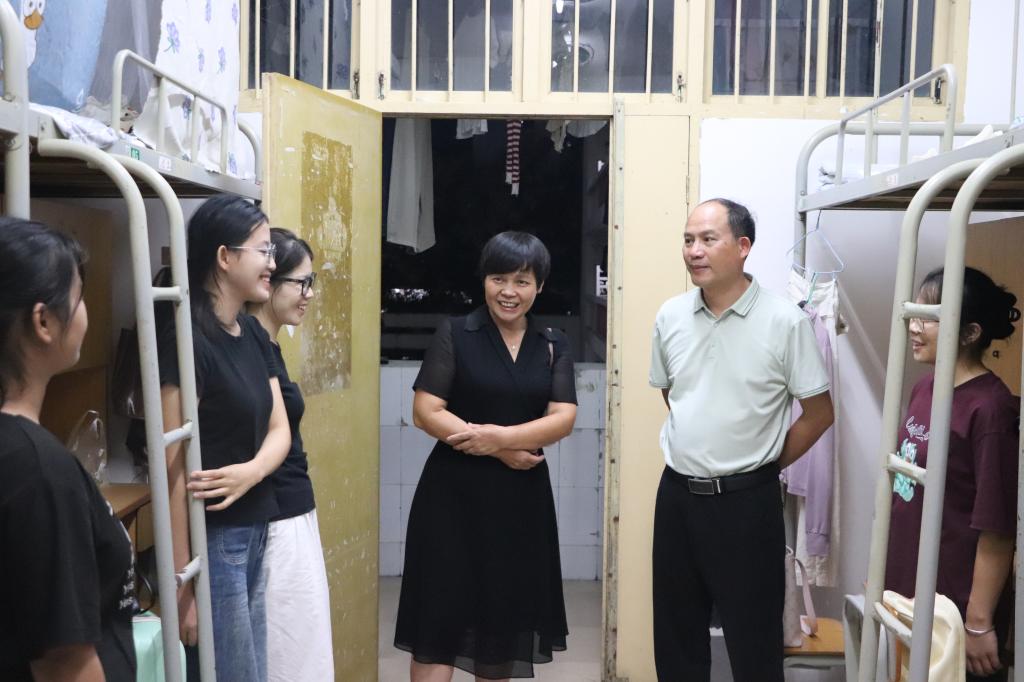 9月15日晚,公司党委书记韦晖、经理邓琴、党委副书记郭英莉及全体辅导员、新生班主任深入2025级新生宿舍,看望并慰问刚入校的新同学,送上公司的关怀与温暖。