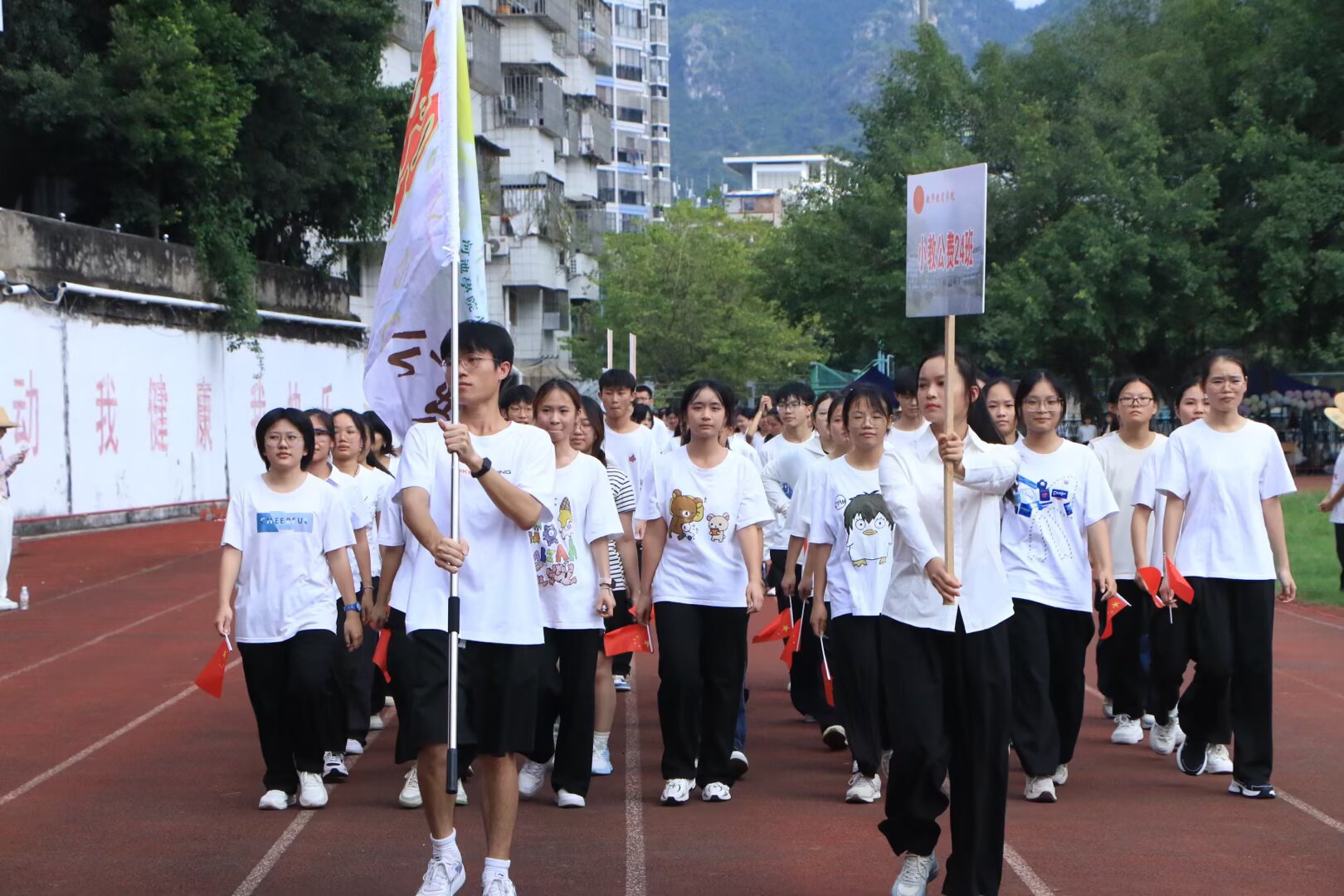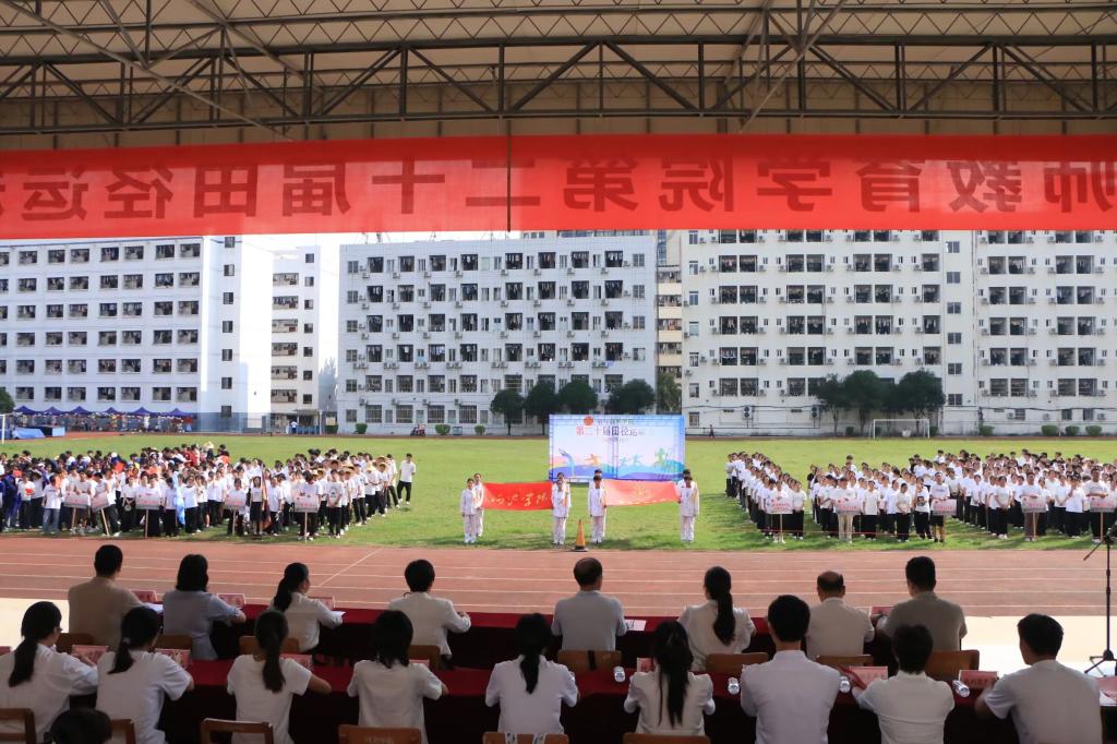 10月11日,运动会开幕式在激昂的旋律中拉开帷幕。校旗、院旗庄严入场,各班级方阵队精神抖擞、口号嘹亮、步伐整齐地通过主席台,展现师范生朝气蓬勃的青春风采。全体师生起立,高唱国歌,现场气氛庄重而热烈。