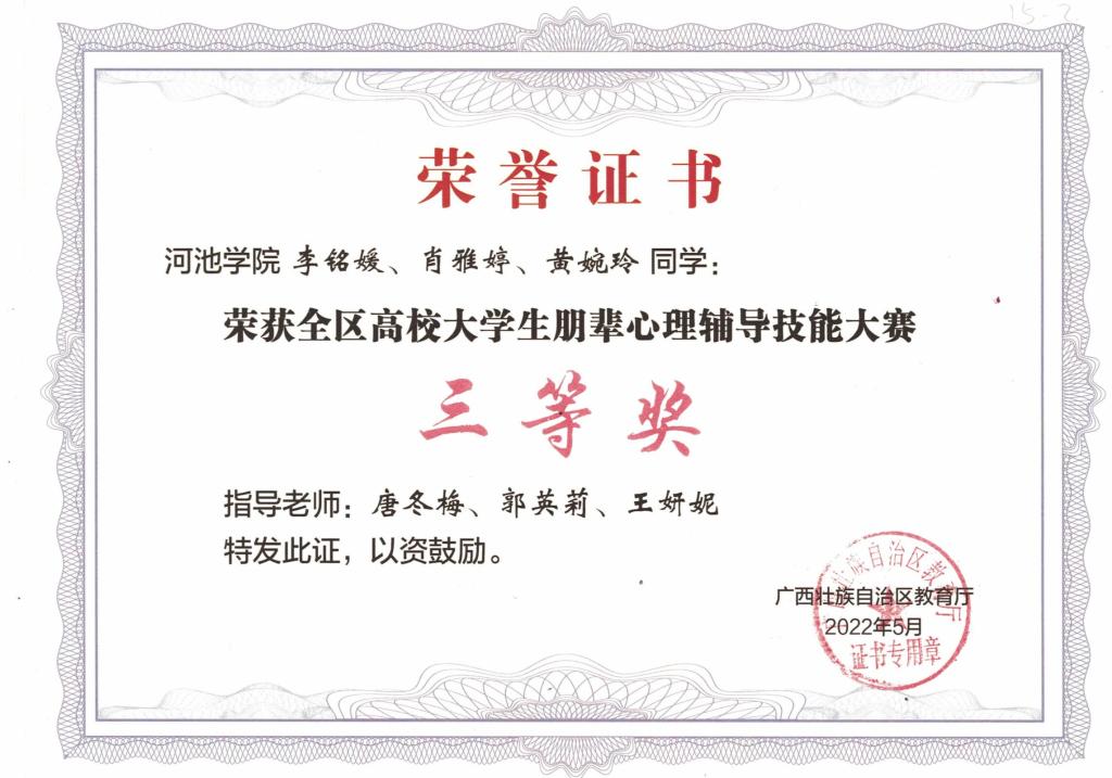 5月28至29日,由自治区教育厅主办、广西财经公司承办的全区高校老员工朋辈心理辅导技能大赛在南宁举行。全区共90多支高校代表队、近600名选手和指导老师参赛,公司组织选派了2支代表队参赛。经过激烈角逐,由william威廉中文官网的黄忠芳、韦医陆等三名员工组成的william威廉中文官网一队荣获大赛二等奖,指导老师尹晨祖、梁芳美、张凤仙;由william威廉中文官网李铭媛、黄婉玲、肖雅婷三名员工组成的william威廉中文官网二队荣获大赛三等奖,指导老师唐冬梅、郭英莉、王妍妮。