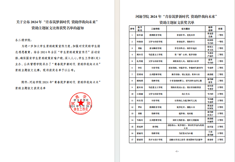 根据《关于公布2024年“青春筑梦新时代 资助伴我向未来”资助主题征文比赛获奖名单的通知》内容,公司徐积波同学的征文《青春年华,星光作伴》获得一等奖,罗桢同学的征文《筑梦花开,拥抱未来》、丁火玲同学的征文《国家资助,你是我的眼》获得三等奖。
