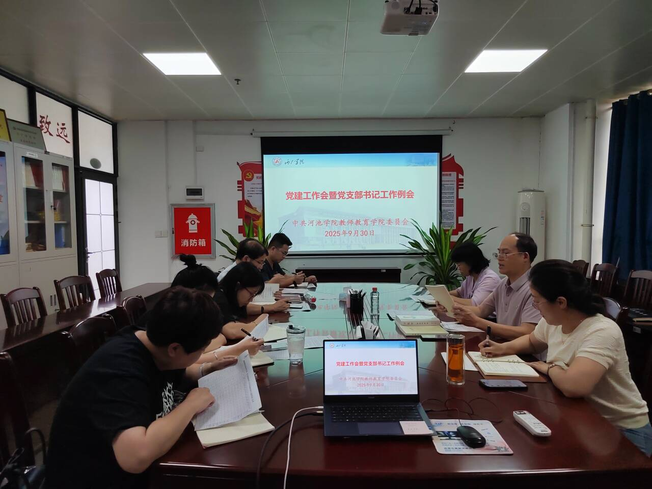 最后,韦晖书记重点就10月开展支部党建交叉检查、教师党员联系班级与员工、党支部“三会一课”、发展党员及党建标杆院系结题等工作作了详细安排。同时,他对公司下一步的党建工作提出要求:一要持续加强理论武装,严格落实“第一议题”与理论学习制度;二要抓实抓好党支部建设,充分发挥党支部“战斗堡垒”作用,并在审核评估等重大活动中充分体现党建引领业务发展的强大力量;三要探索创新党支部工作载体,推进“党建+业务”双融双促。(作者:吴佳明;拍摄:吴佳明;校对:韦雅文;审核:韦晖)