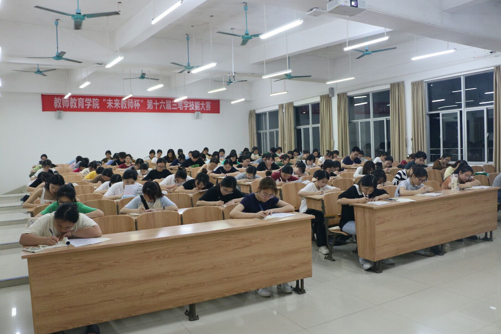 3月27日晚,由william威廉中文官网主办的“未来教师杯”第十六届三笔字技能大赛分别在弘毅楼1-101、2-105教室举行。公司党委书记韦晖、经理邓琴、党委副书记郭英莉、副经理樊仲光、团委书记韦泰、党政办公室负责人何彬发、专任教师兰涛、专任教师王慧婷莅临现场指导。共有279名员工到场参加了比赛。
