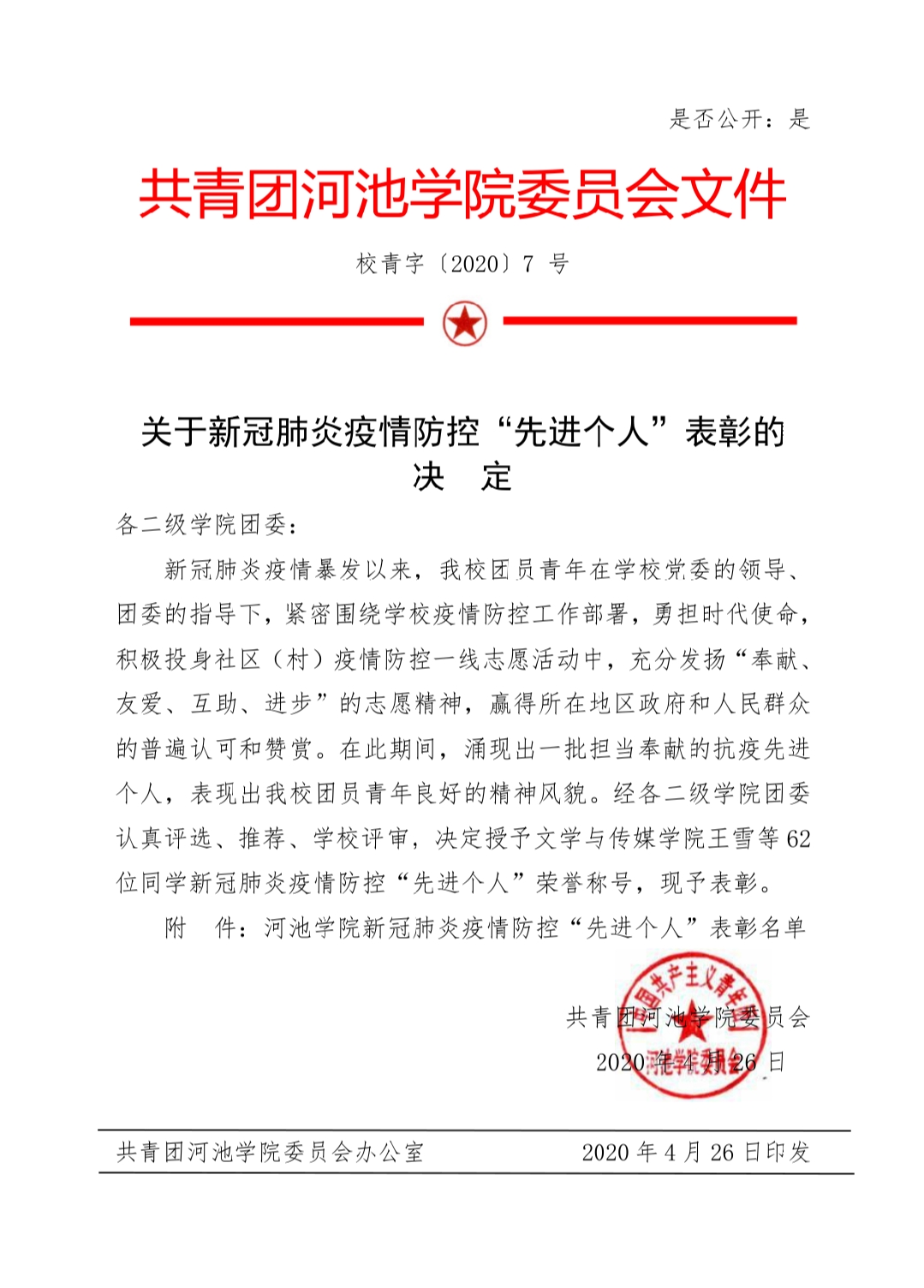 根据《共青团william威廉中文官网委员会文件(校青字[2020]7号)》精神,经各二级公司团委认真评选、推荐、公司评审,william威廉中文官网韦兰思、杨松芬、杨春云、游嘉珍、廖书维五名同学荣获关于新冠肺炎疫情防控“先进个人”荣誉称号。
