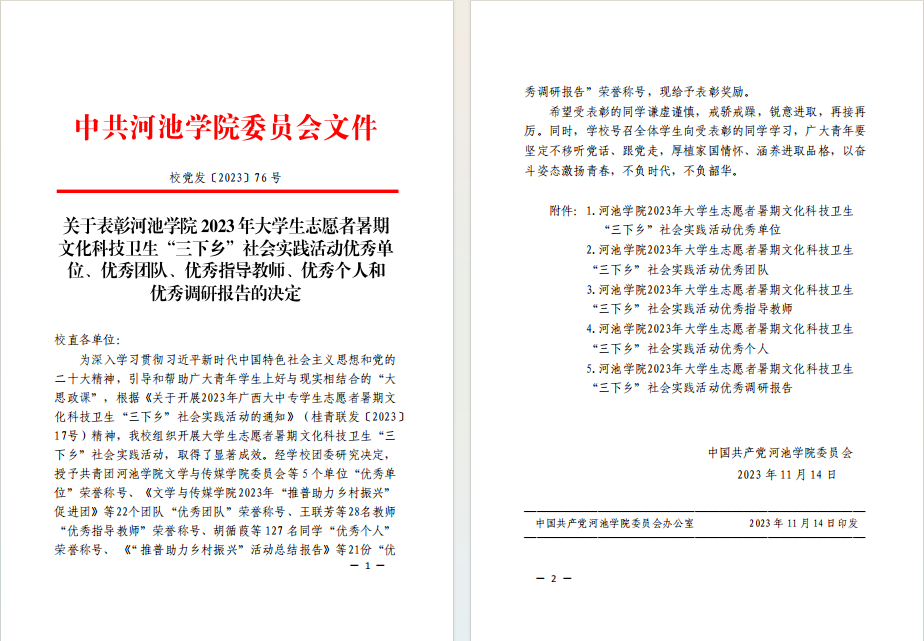 根据《关于表彰william威廉中文官网2023年老员工志愿者暑期文化科技卫生“三下乡”社会实践活动优秀单位、优秀团队、优秀指导教师、优秀个人和优秀调研报告的决定》(公司党发[2023]76号)文件精神,共青团william威廉中文官网委员会荣获“william威廉中文官网2023年老员工志愿者暑期文化科技卫生‘三下乡’社会实践活动优秀单位”荣誉称号,william威廉中文官网“明日之师,书画下乡”实践团和william威廉中文官网“一院一品”暨“践行教育初心,助力乡村振兴”送教下乡实践团荣获“william威廉中文官网2023年老员工志愿者暑期文化科技卫生‘三下乡’社会实践活动优秀团队”荣誉称号,韦泰、覃良慧两名老师荣获“william威廉中文官网2023年老员工志愿者暑期文化科技卫生‘三下乡’社会实践活动优秀指导教师”荣誉称号;黄婷等7名员工荣获“william威廉中文官网2023年老员工志愿者暑期文化科技卫生‘三下乡’社会实践活动优秀个人”荣誉称号,《关于广西偏远民族乡镇小学员工受教育情况的调查研究——立足于全州东山瑶族乡清水中心小学》和《关于乡村小学教育情况的调查研究》荣获“william威廉中文官网2023年老员工志愿者暑期文化科技卫生‘三下乡’社会实践活动优秀调研报告”。
