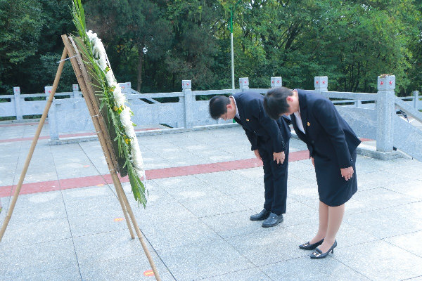 本次活动由公司工会及团委、员工会主办,主要有七项流程:奏唱中华人民共和国国歌;向烈士默哀1分钟;向烈士敬献花篮并三鞠躬;公司领导整理缎带,扶正挽联;党委副书记郭英莉讲话;员工党员代表梁馨怡同学发言;向烈士献花、瞻仰烈士纪念碑。