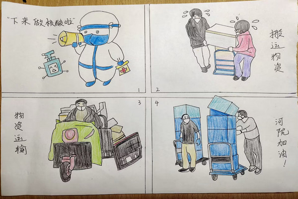 在公司党委的指导下,公司员工第三党支部党员带领同学们拿起手中的画笔,用独特的绘画方式捕捉那些平凡而伟大的瞬间,记录了全校师生齐心协力、共克时艰的点点滴滴。在第一期“齐心抗疫,感恩有你”主题绘画作品中,公司教师克服一切困难坚持线上上课、忘小家顾大家地为同学们送一日三餐、在严寒中组织同学们做核酸检测;后勤工作人员坚守工作岗位,坚决完成好供餐任务、保障食品安全、落实防疫措施等工作:这些内容都在同学们的绘画作品中得到了精彩纷呈地展示。绘画作品通过对坚守一线、无私奉献的教师和后勤工作人员的赞美,表达了同学们对奋战在抗击疫情一线的工作人员的崇高敬意,展示全校师生众志成城、防病抗疫的积极状态。